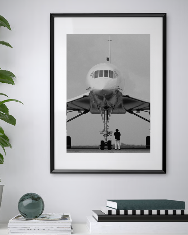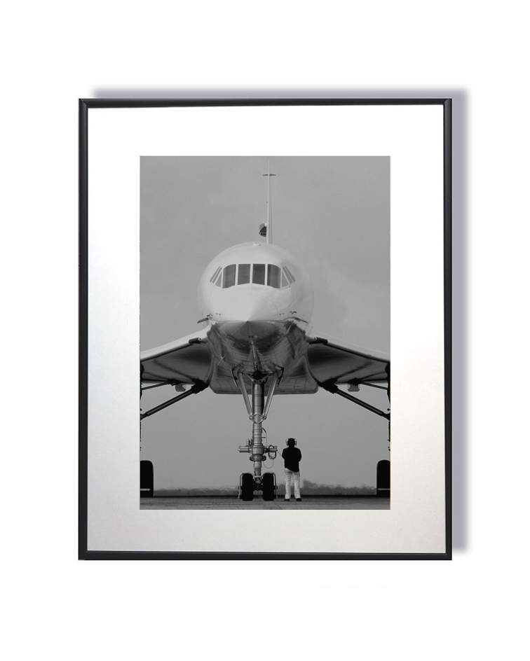 Un face-à-face presque irréel entre un homme minuscule et une machine colossale : le Concorde, géant d’acier aux ailes tendues vers l’horizon. Dans cette photographie en noir et blanc, l’humain se tient là, humble, en tête-à-tête avec un chef-d’œuvre de technologie et de rêve. Il ne s'agit pas seulement d’un avion, mais d’une légende ; pas seulement d’un homme, mais du gardien silencieux de cette icône aérienne. Cette image fige l’instant où la fragilité de l’homme rencontre la puissance de son ambition.