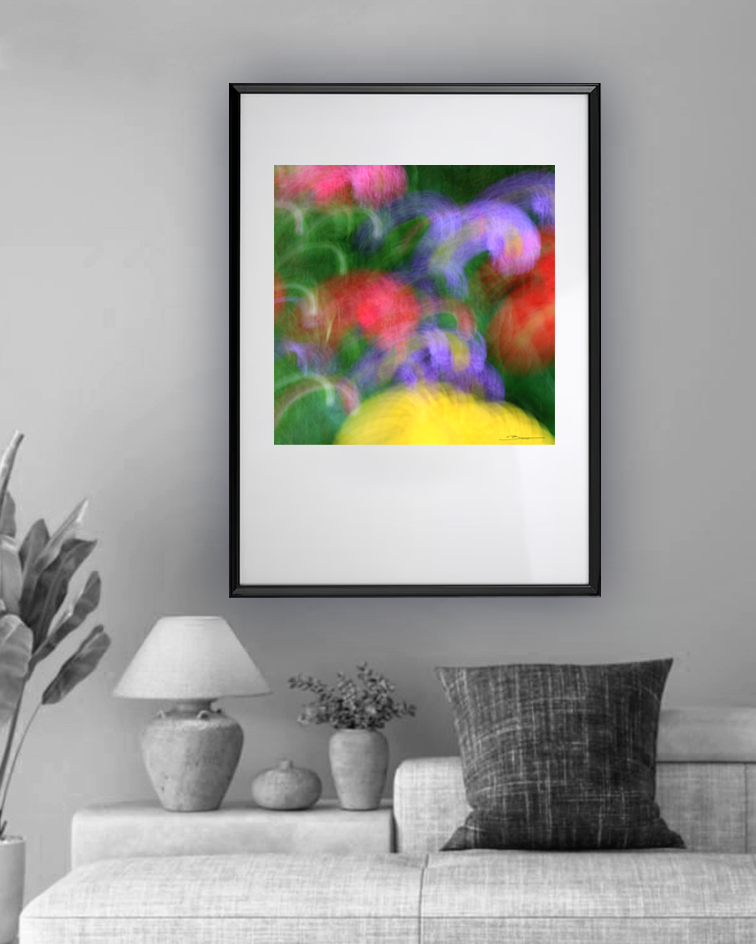 Cette photographie célèbre la beauté du flou et du mouvement. Dans une harmonie de couleurs vives et de lumières mouvantes, cette œuvre impressionniste transforme un simple bouquet en symphonie visuelle.