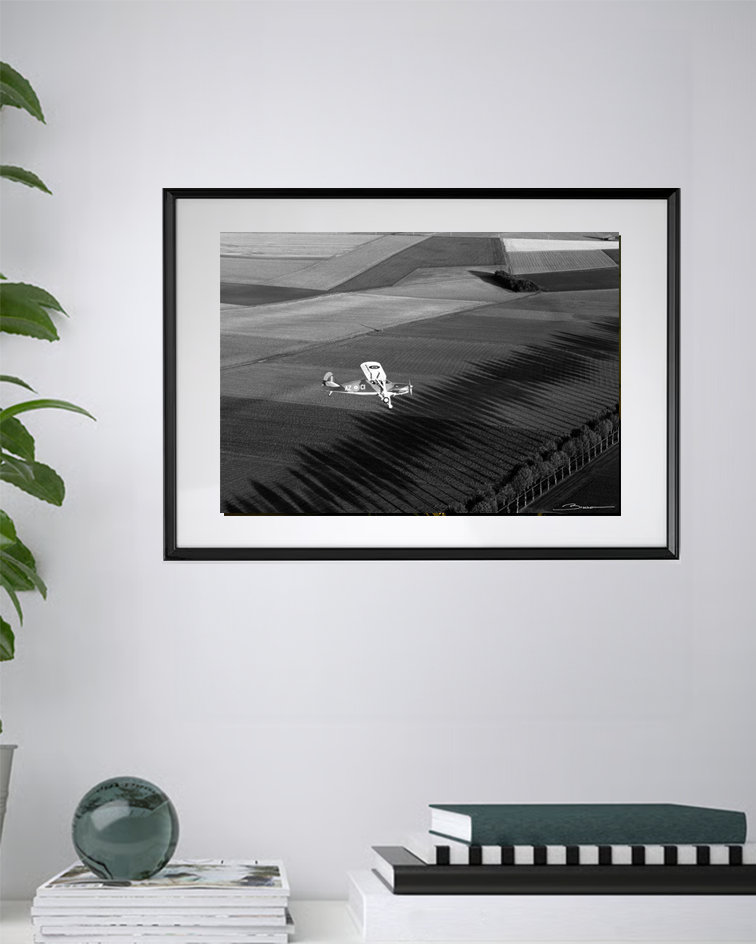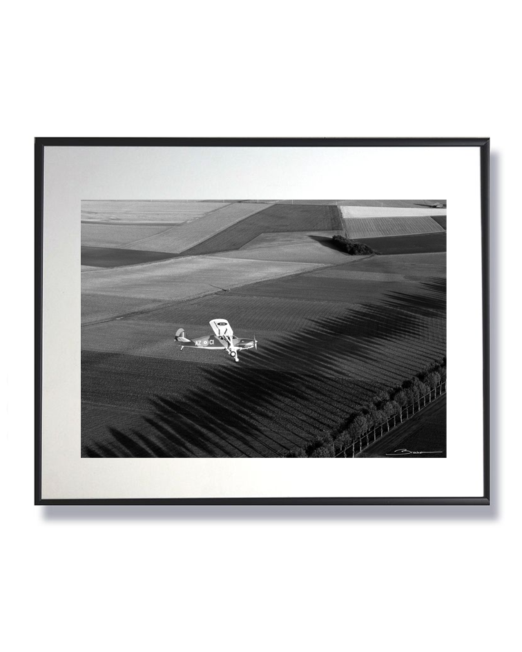 Dans un ciel calme, le Fairchild trace son chemin au-dessus d’un patchwork de champs. Les ombres des arbres s’étirent en une chorégraphie naturelle, offrant à cette photographie en noir et blanc une beauté intemporelle et contemplative.