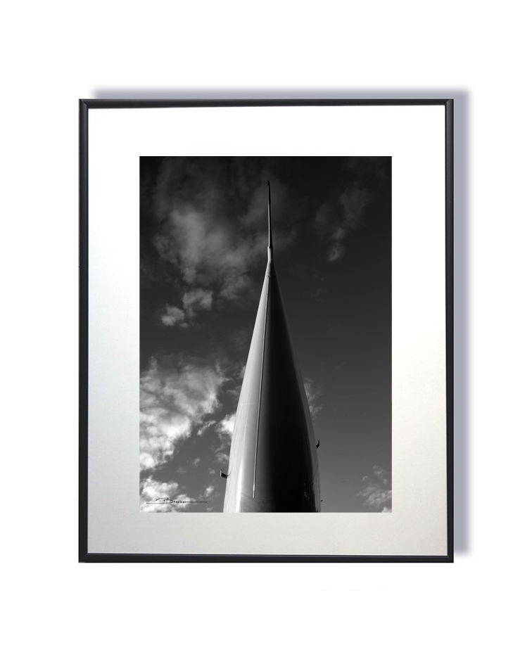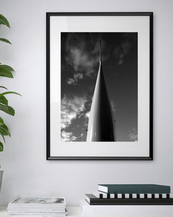 Dans un ciel tourmenté de nuages et de silence, une flèche d'acier fend l'horizon avec une grâce froide et majestueuse. Capturée en noir et blanc, cette image hypnotique évoque l’élan, la verticalité et la quête de l’inconnu. Entre ombre et lumière, le nez effilé de l'avion semble vouloir transpercer les cieux et toucher l'éternité. Une ode visuelle à l'aérien, au voyage et à la puissance tranquille du métal en mouvement.