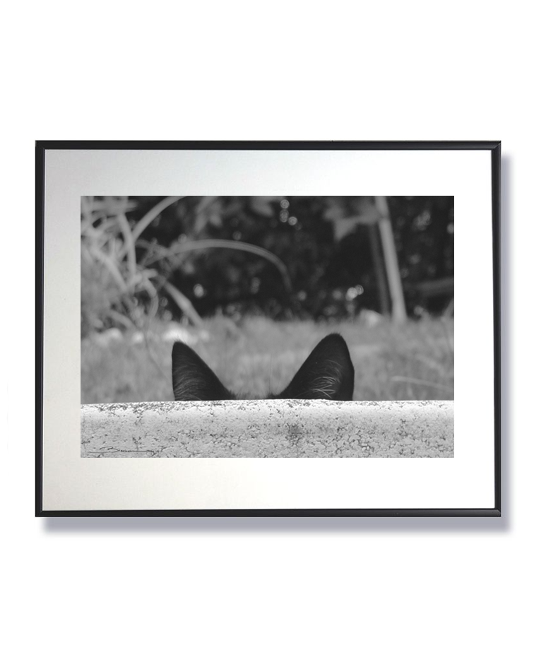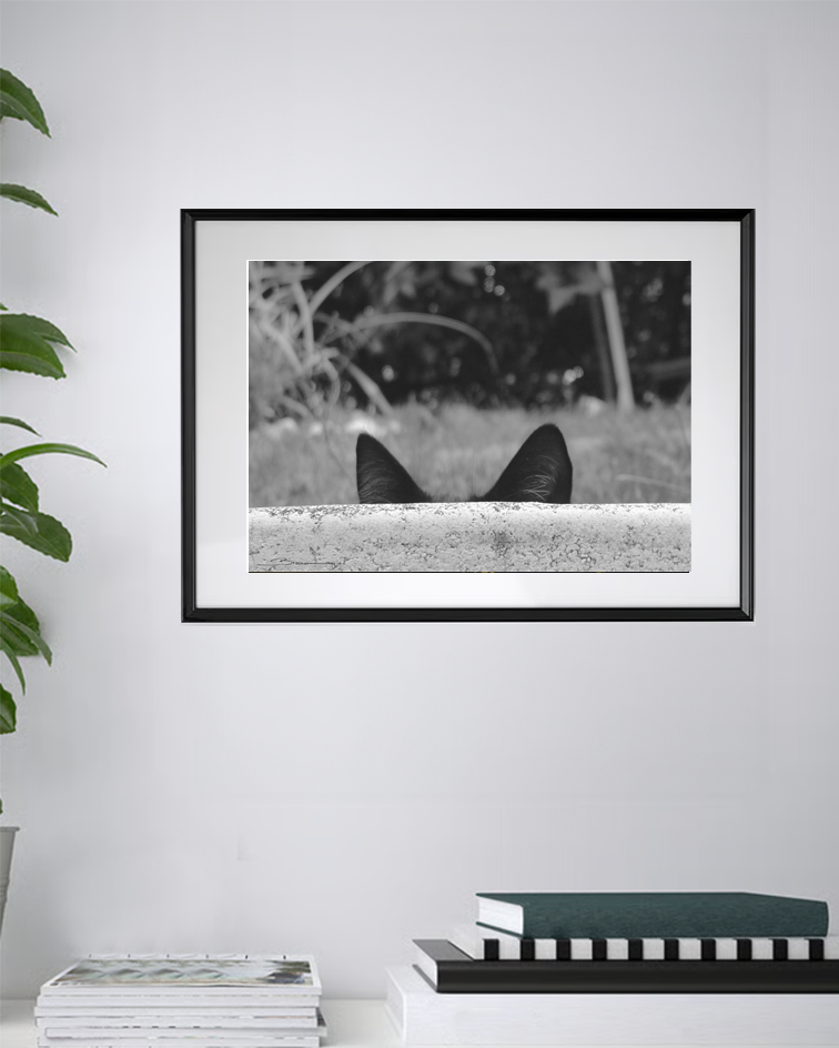 Photo artistique en noir et blanc capturant deux oreilles derrière un muret, semblant écouter les secrets du vent. Une scène délicate et mystérieuse pour éveiller l’imagination.