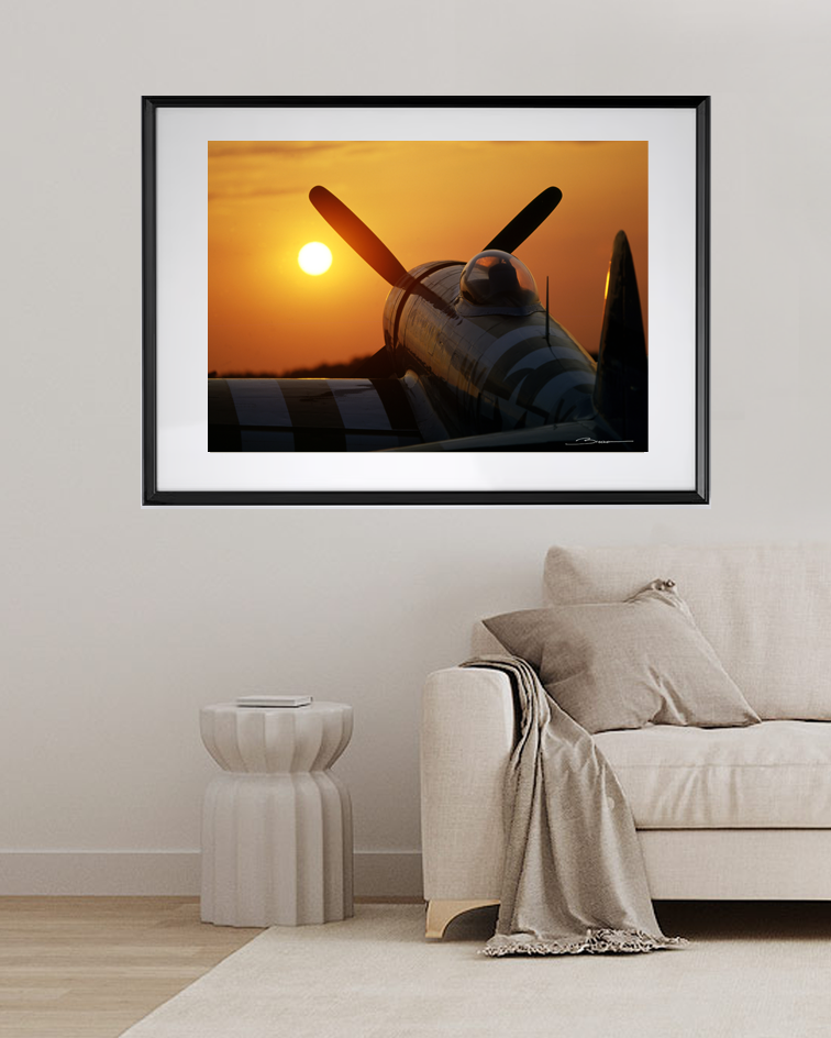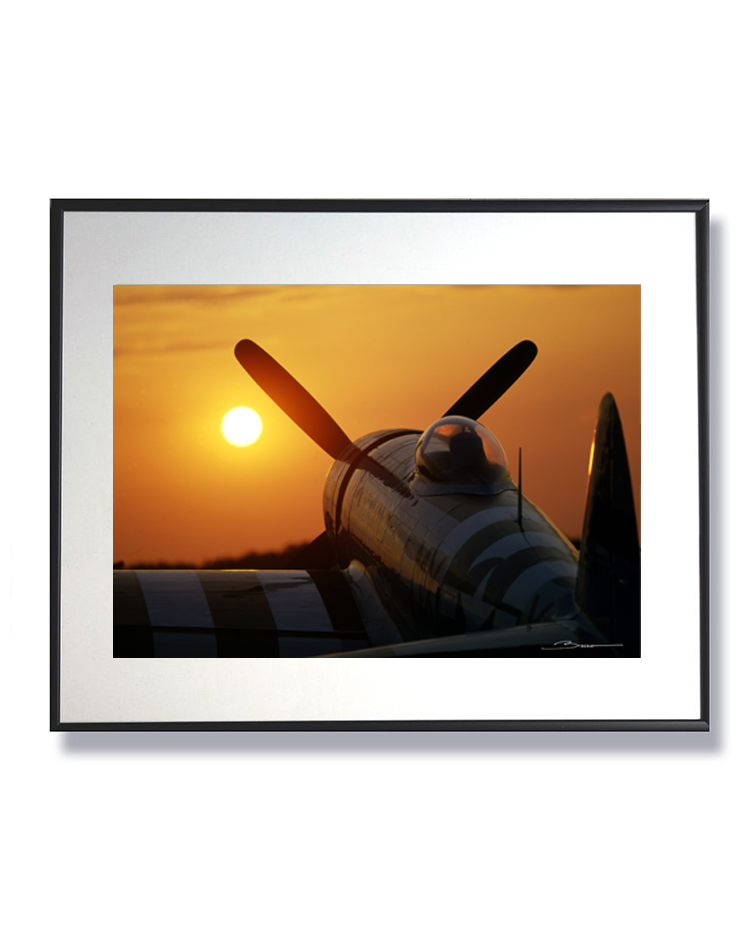 Sous un ciel embrasé par les derniers feux du jour, un avion légendaire se dresse,le P-47 Thunderbolt, silhouette noble face au soleil couchant. Le reflet doré caresse son fuselage, témoin silencieux de mille histoires aériennes. Cette photographie capture l’instant suspendu entre ciel et terre, où passé et éternité se frôlent dans la lumière d’un adieu flamboyant. Une ode visuelle à la liberté, à l'élégance mécanique et au souffle du vent.
