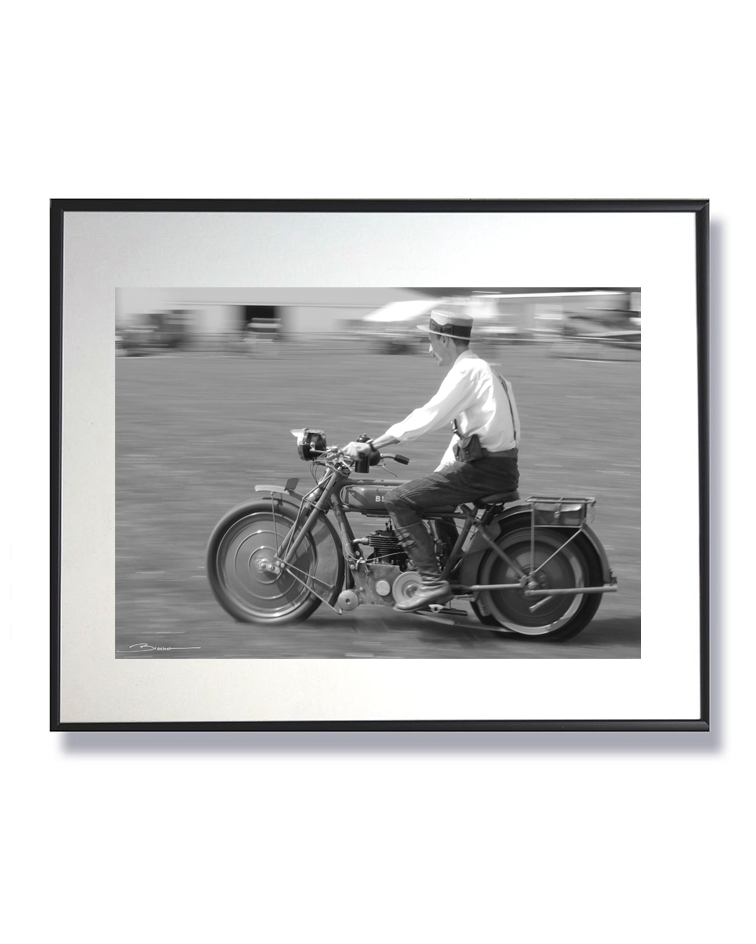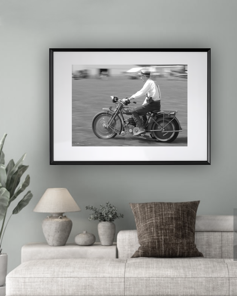Sous le vent figé d’une photo en noir et blanc, un homme file sur sa monture d’acier comme s’il chevauchait l’écho d’un autre siècle, ses roues infatigables donnant l’illusion que l’instant s’échappe, voyage immobile où mémoire et vitesse se confondent et où l’histoire roule encore à travers la lumière d’hier.