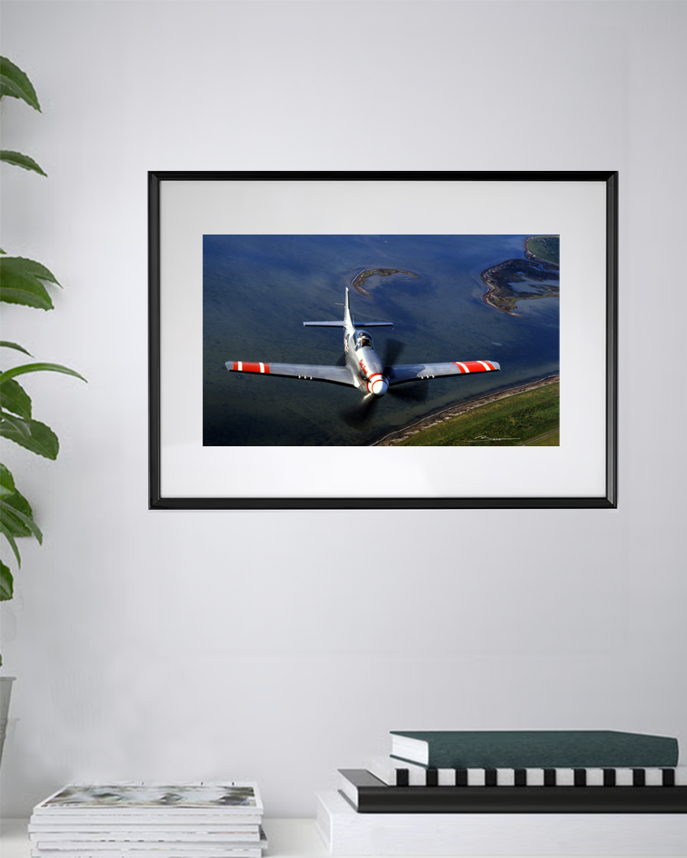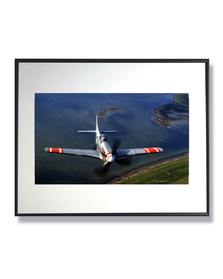 Élancé dans l'azur, un chasseur d'argent fend le ciel comme un souvenir vivant des vents de liberté. Le North American P-51 Mustang, fièrement marqué de rouge, plane au-dessus des rivages secrets, caressant de son ombre les eaux calmes et les îlots silencieux. Cette image capture l’éternité d’un vol, entre mémoire guerrière et poésie aérienne. Un hommage vibrant à la beauté des cieux et à l’élégance mécanique d’une légende volante.