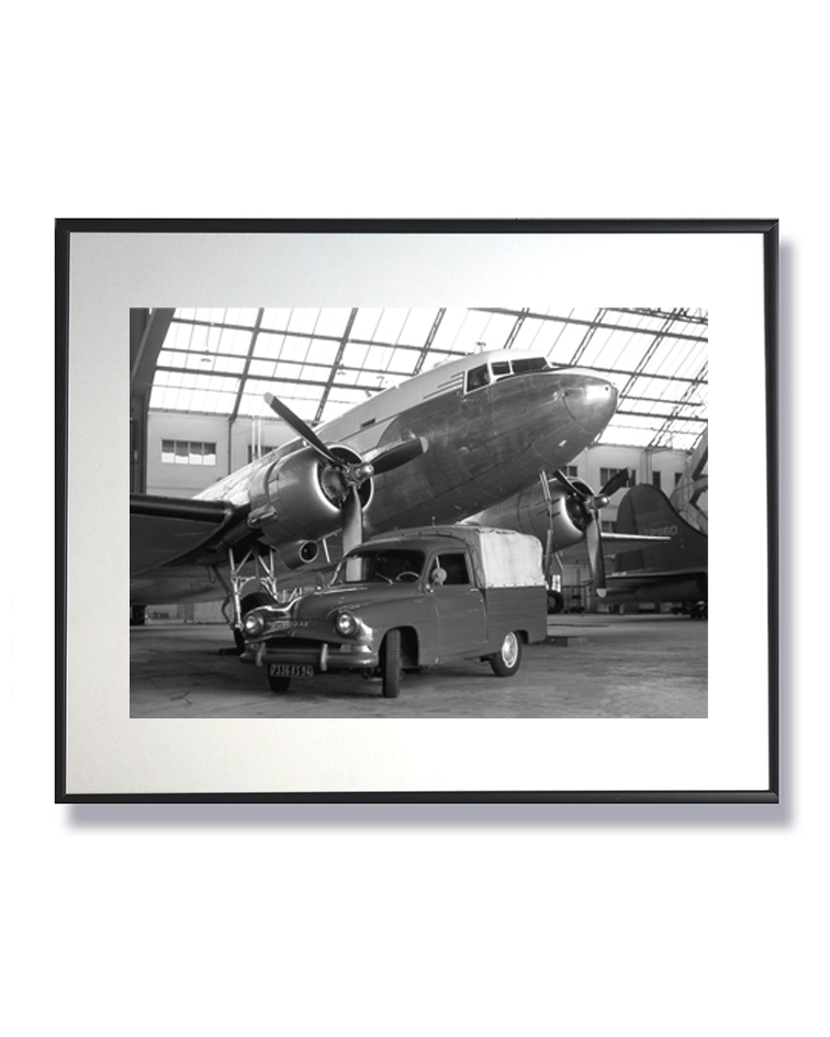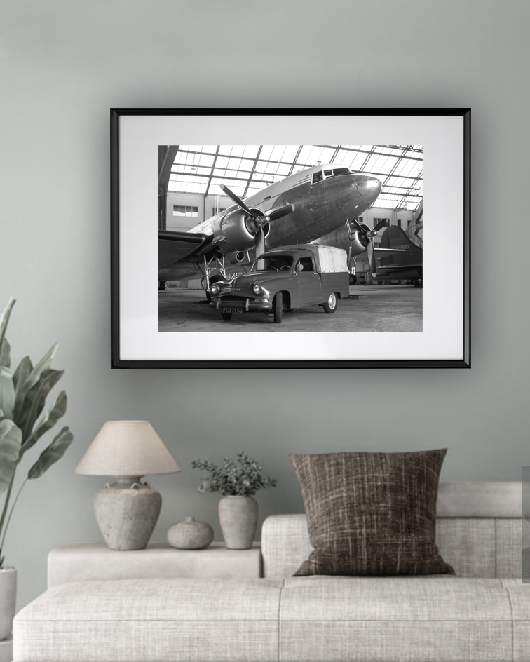 Un avion mythique le Douglas DC3 et une voiture discrète se rejoignent dans la lumière d’un hangar. Comme deux rêves figés, ils portent en eux l’écho des départs, des retours et des routes infinies. L’avion et la voiture se dressent comme deux témoins d’une époque révolue. L’un prêt à conquérir le ciel, l’autre fidèle à la route. Ensemble, ils racontent la mémoire des voyages et l’élégance du passé.