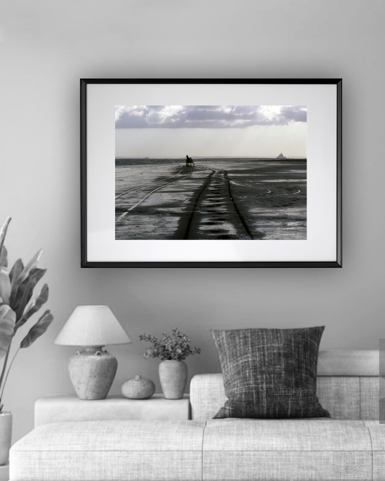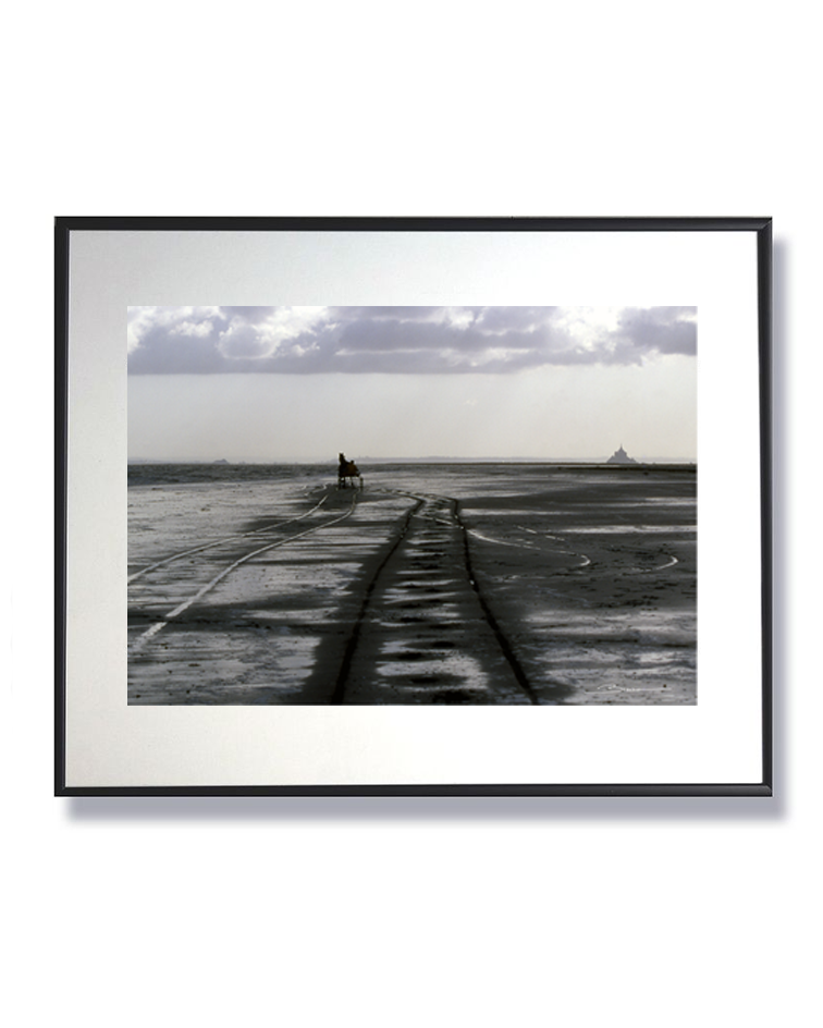 Sur la grève du Mont-Saint-Michel un sulky avance lentement vers l'horizon, entre ciel tourmenté et reflets d'argent. Sur le sable humide, les traces d’un attelage se perdent vers l'infini, entre lumière et brume. Une image poétique où le mouvement rejoint la contemplation, symbole de liberté et de solitude face à l’immensité.