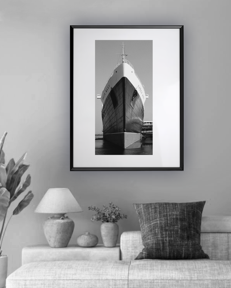 Photographie en noir et blanc du mythique paquebot Queen Mary, figé dans toute sa majesté. Une composition saisissante qui met en valeur la puissance, l’histoire et l’élégance intemporelle de ce géant des mers.
