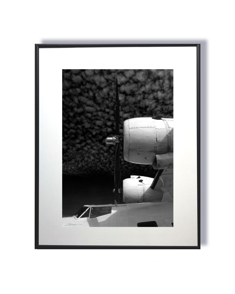 Photo artistique du célèbre PBY Catalina, un hydravion historique capturé dans une composition minimaliste et dramatique, offrant une vision aérienne empreinte de poésie