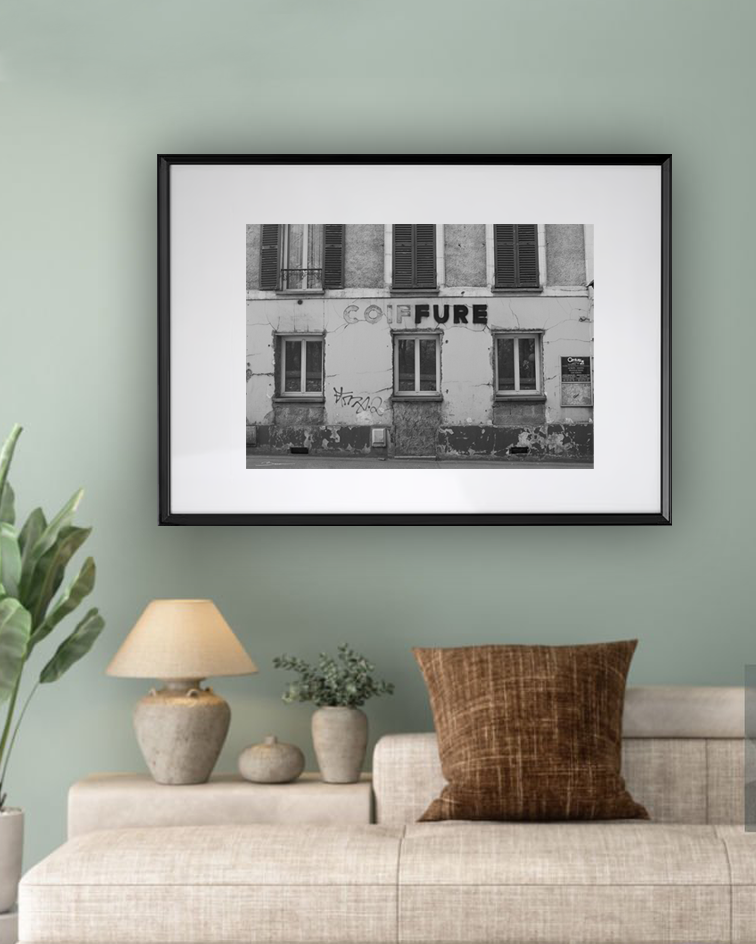 Photographie en noir et blanc d’une ancienne devanture de salon de coiffure, aux lettres écaillées et fissures du temps. Cette image urbaine capture la poésie des façades oubliées, entre mémoire et nostalgie des rues de la ville. Une œuvre murale idéale pour les amateurs de photographie contemporaine, de décoration minimaliste et d’art architectural.