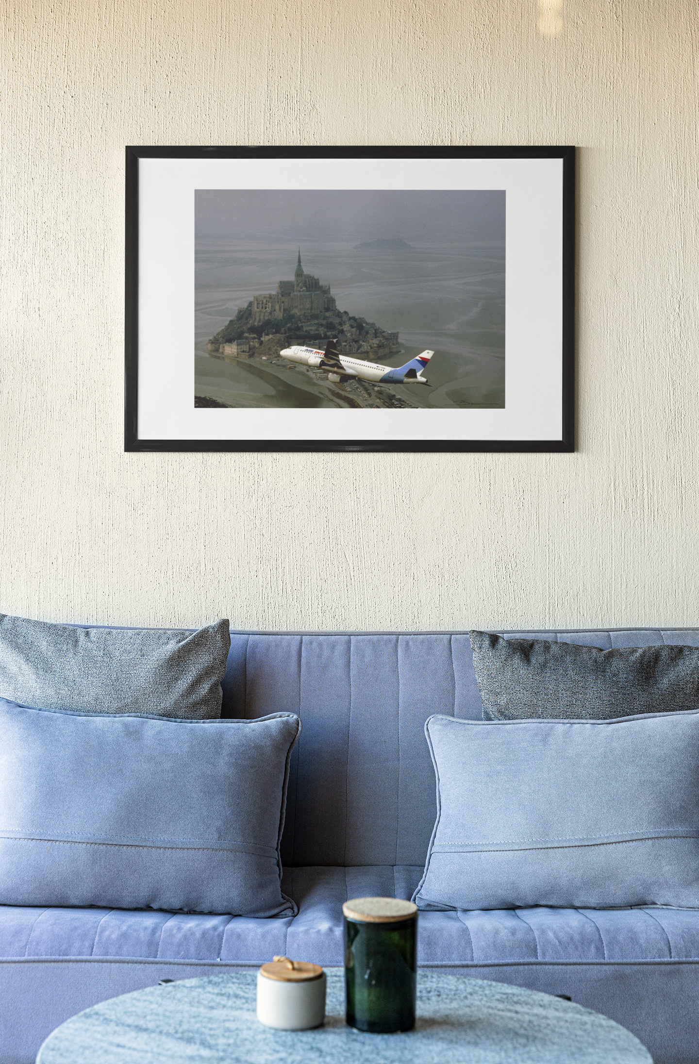 Un Airbus A320 d’Air Inter survole le Mont-Saint-Michel, monument emblématique qui émerge des sables et des marées dans une brume douce. La silhouette de l’abbaye, dressée vers le ciel, contraste avec les lignes modernes de l’avion, créant une rencontre entre patrimoine millénaire et audace aérienne.