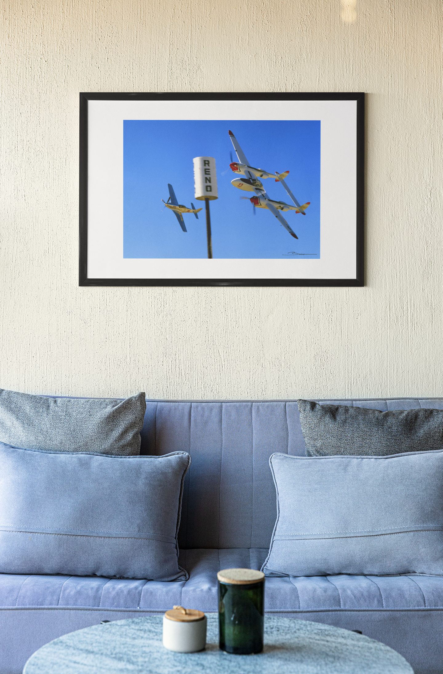 Deux racers de légende plongent à toute vitesse autour d’un pylône marqué « Reno », dans l’adrénaline pure des mythiques Reno Air Races. Le Lockheed P-38 Lightning, numéro 13, et un North American P-51 Mustang se livrent à une danse millimétrée sous un ciel d’un bleu éclatant, rappelant la passion, la précision et la vitesse qui animent ces courses uniques au monde.