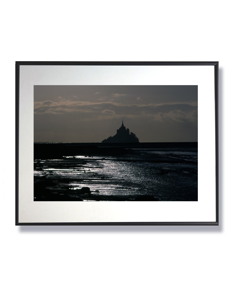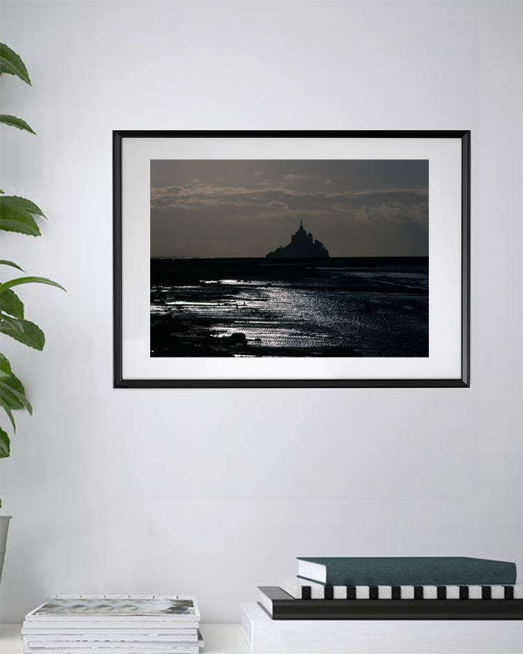 Au crépuscule, la mer se change en miroir d’argent et la silhouette du Mont-Saint-Michel trône, immuable, face aux vents et au temps. Une photographie qui respire l’éternité.