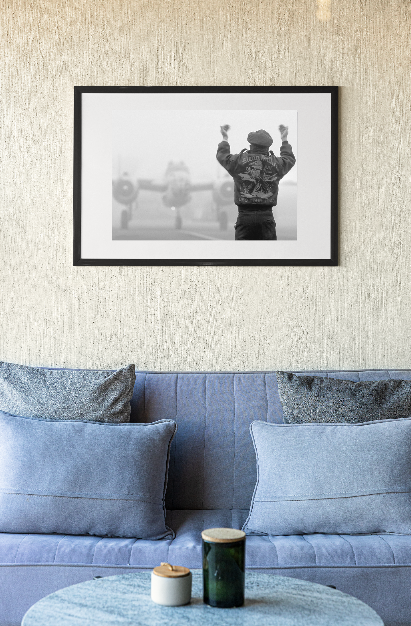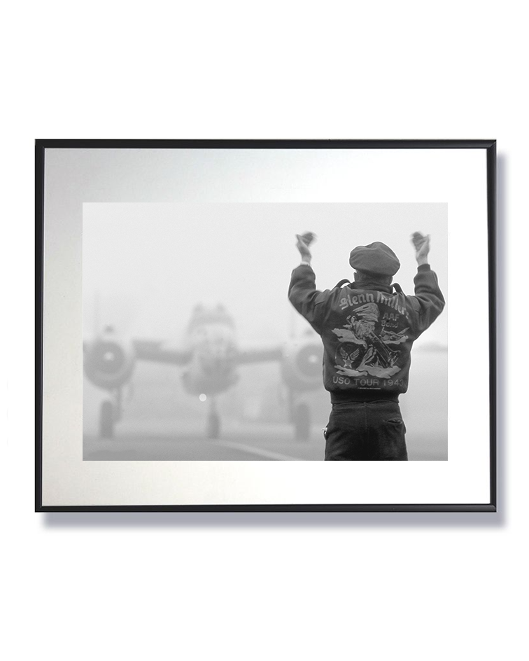 Plongez dans l'histoire avec cette photographie emblématique en noir et blanc montrant un membre de l’USAAF accueillant un bombardier B-25 Mitchell sur une piste embrumée en 1943. Vêtu d’une veste à l’effigie de la Glenn Miller Army Air Force Band – USO Tour 1943, ce soldat symbolise l’union entre musique, moral des troupes et aviation pendant la Seconde Guerre mondiale. Une image saisissante de courage et de camaraderie.